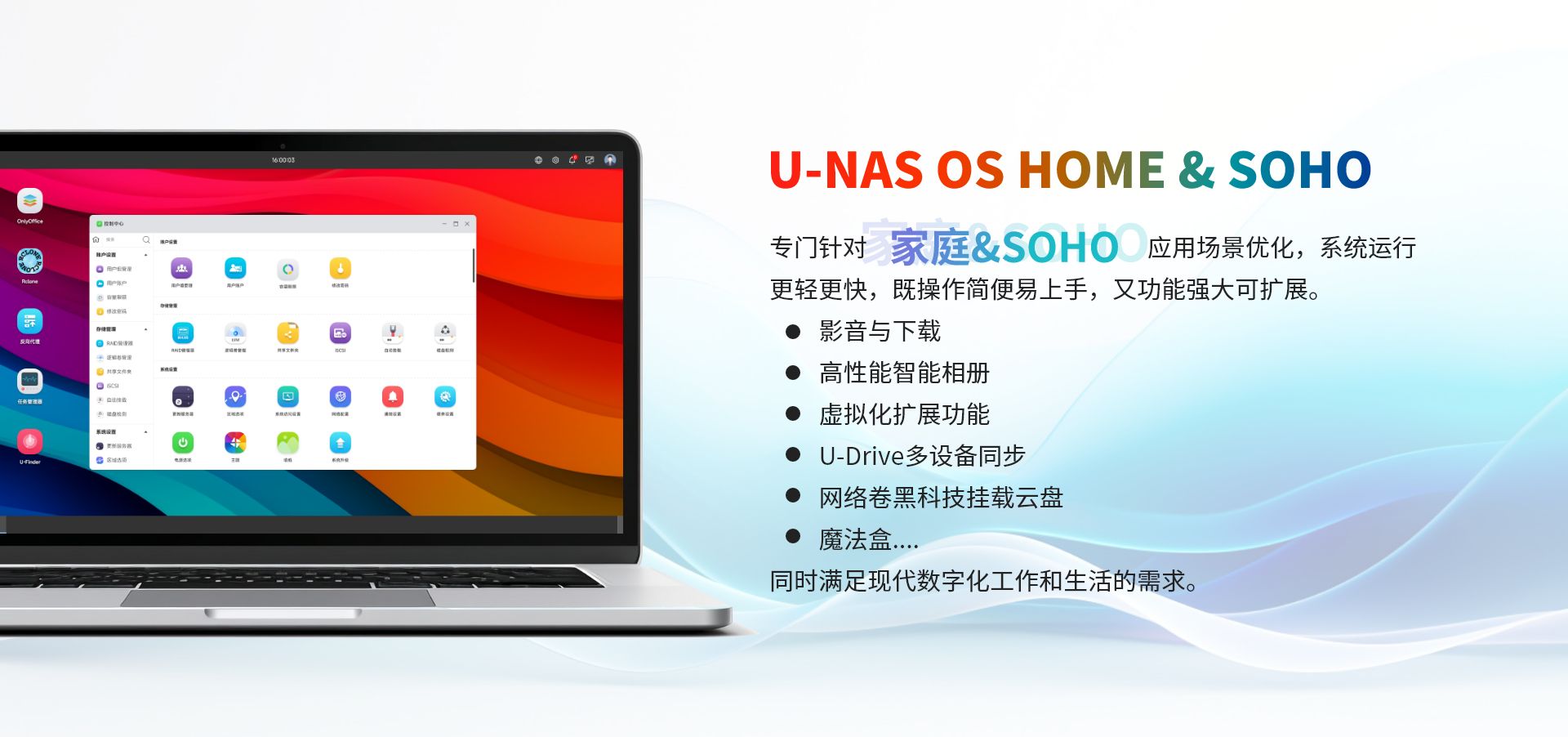 基于萬由U-NAS OS 體系的存儲、備份、私有云服務的一體化平臺,為企業(yè)提供一套安全、高性能、彈性可擴展的一體化數據統一管理、主動備份和數據在不同地區、不同設備同步的解決方案。并提供個性化的定制服務,使企業(yè)的TOC(總體擁有成本)最低